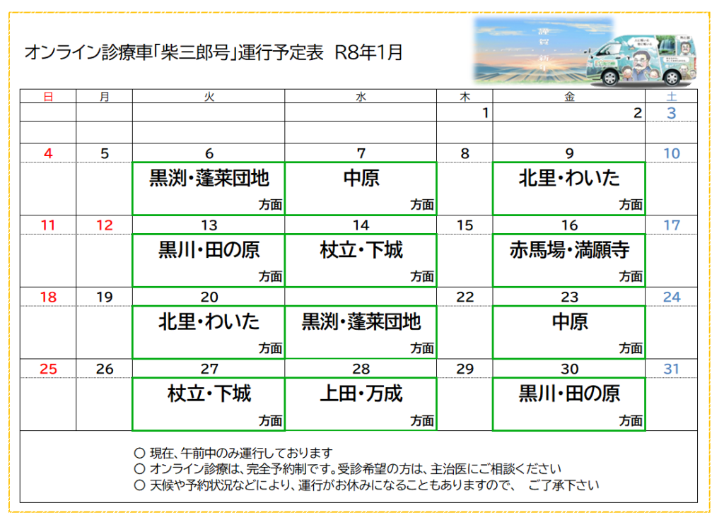 オンライン診療車「柴三郎号」R8年1月運行表